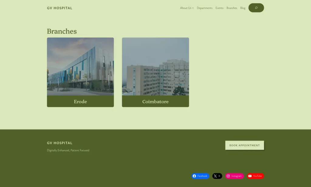 Guide patients to all your hospital locations from one central page. We’ve organized each branch into a clean grid of cards, making it simple for patients to explore their nearest options and access location-specific details.
