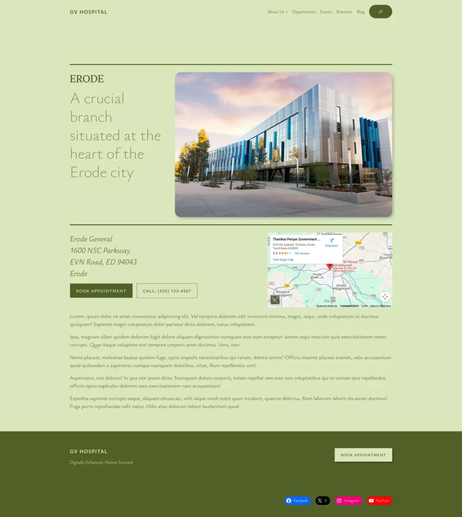 Anchor your hospital’s presence in the community. This location-centric layout gives patients everything they need to find you, including a clear address, an interactive map, and direct contact info. It removes friction, making it simple for users to choose their nearest location and book an appointment.